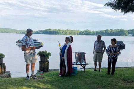 Brookfields Rotary celebrated the induction of its 2019-20 Board of Directors on June 30 at the summer home of one of our members on bucolic Quaboag Pond in Brookfield. The club was honored to have two Past District Governors on hand, Klaus Hatchfeld from the Sturbridge club and T. Tall from the Middlebury, Vermont club. Klaus, ably assisted by T. Tall, inducted President Luanne McLeod and her Board.