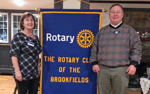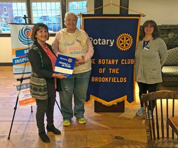 Each Year at this time, Brookfields Rotary assists Food Pantries in one or more of our communities. This year, we donated $250 to the Food Pantry in North Brookfield. Seen here accepting the check on behalf of the First Congregational church is Rotarian and North Brookfield resident Chet Lubelczyk. Vice President Lynn Duffy-O'Shea presents the gift.