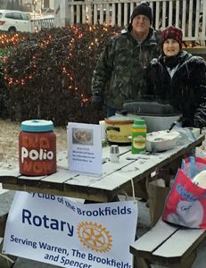 Once again this year, Brookfields Rotarians were on hand to help warm up festive celebrants attending the Warren Christmas Tree Lighting. Community Services Director Mike Dupsha, and VP Lynn Duffy-O'Shea braved the cold and snowy weather to serve chop suey.